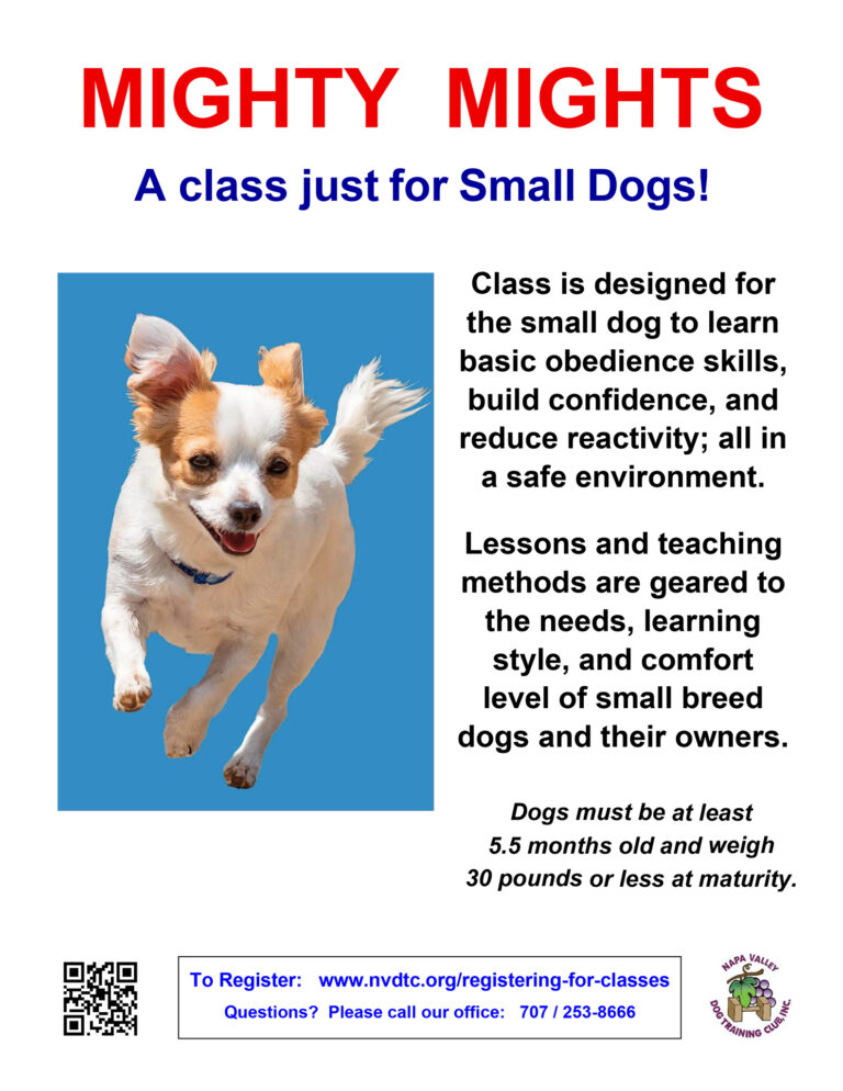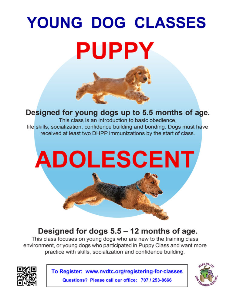 Class description flyers shown below can be downloaded as printable PDFs and represent the variety of classes taught at Napa Valley Dog Training club. To see when these classes are being offered beyond our current set of classes, visit our UPCOMING CLASSES link. To view our year-round session calendar, visit our YEAR ROUND SESSIONS SCHEDULE. To view our list of class descriptions, visit our CLASS DESCRIPTIONS page.